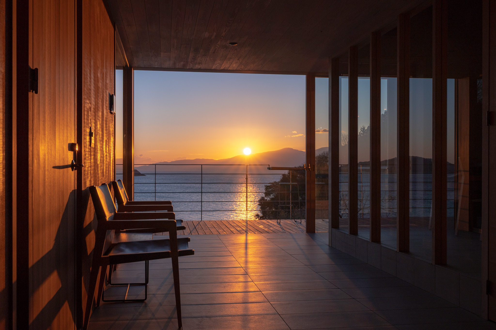 テラスのハイカウンターやソファーに腰かけ、ワインを片手にゆっくりと瀬戸内海の多島美を眺める。
