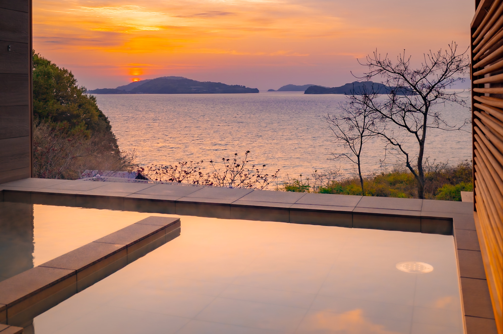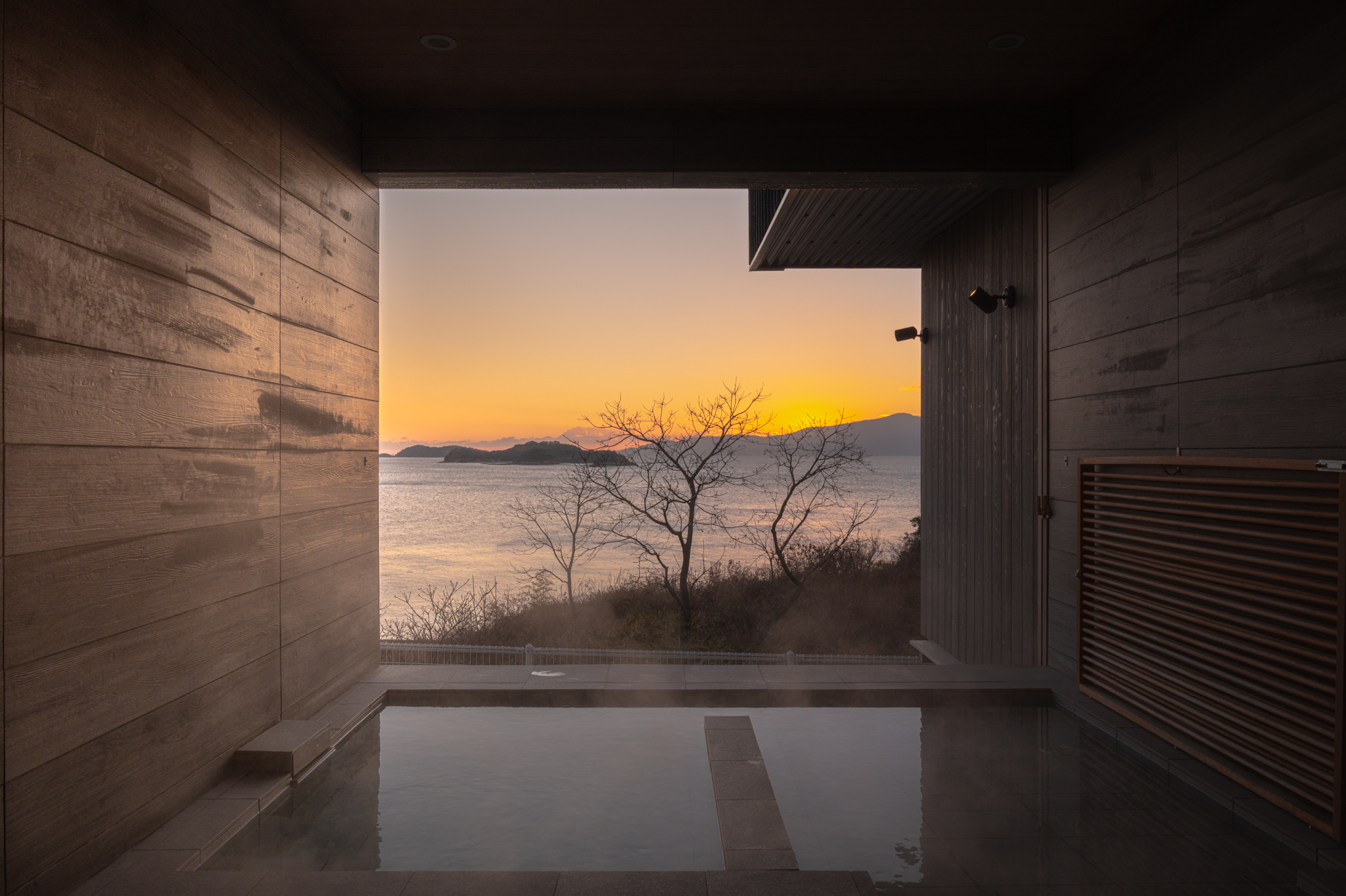 大きな窓の先に瀬戸内海が広がり、湯船に浸かると、まるで海と一体になったような感覚を味わえます。